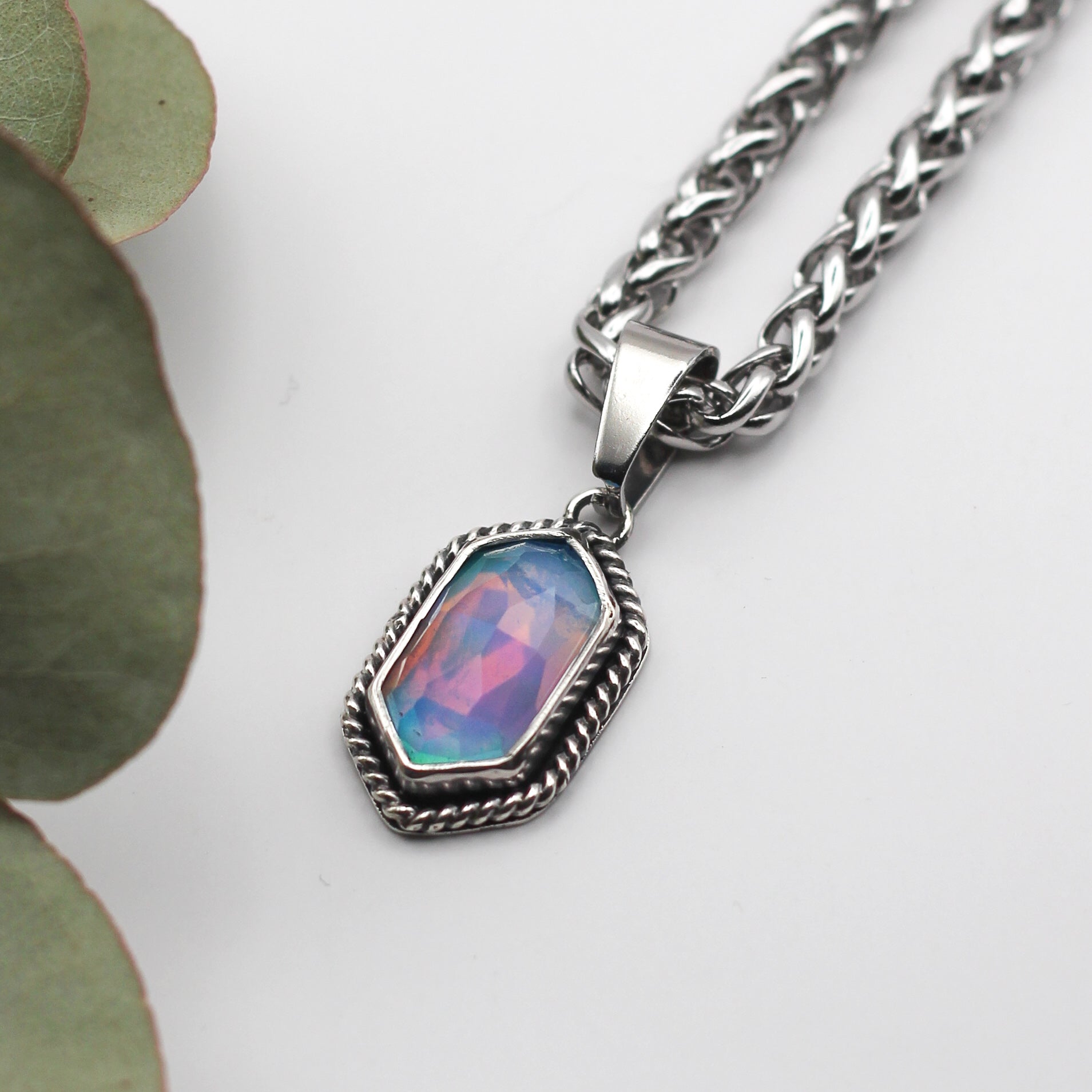 This handmade sterling silver pendant features a single Aurora Opal, set in a sterling silver bezel. Each piece is individually made and one of a kind.
