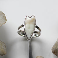 This listing is for one made-to-order Large Tooth ring. Suitable for teeth 11mm tall and over. Each ring is completely handmade from 100% sterling silver, ensuring it will fit your chosen tooth perfectly.