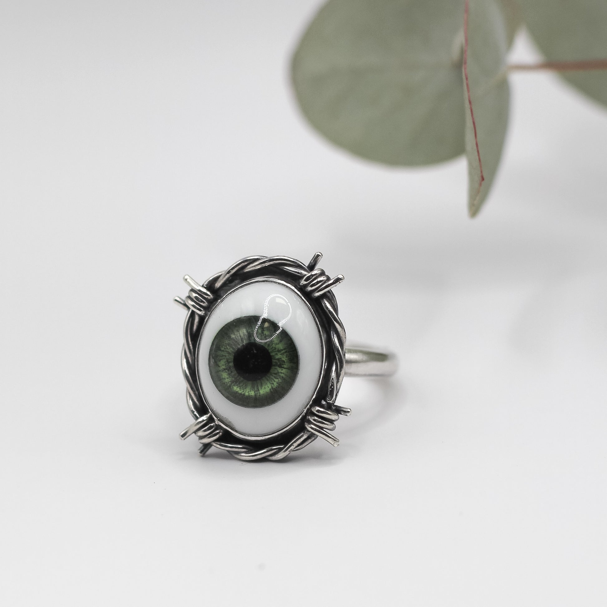 This Sterling Silver ring contains one green 14mm glass eye.