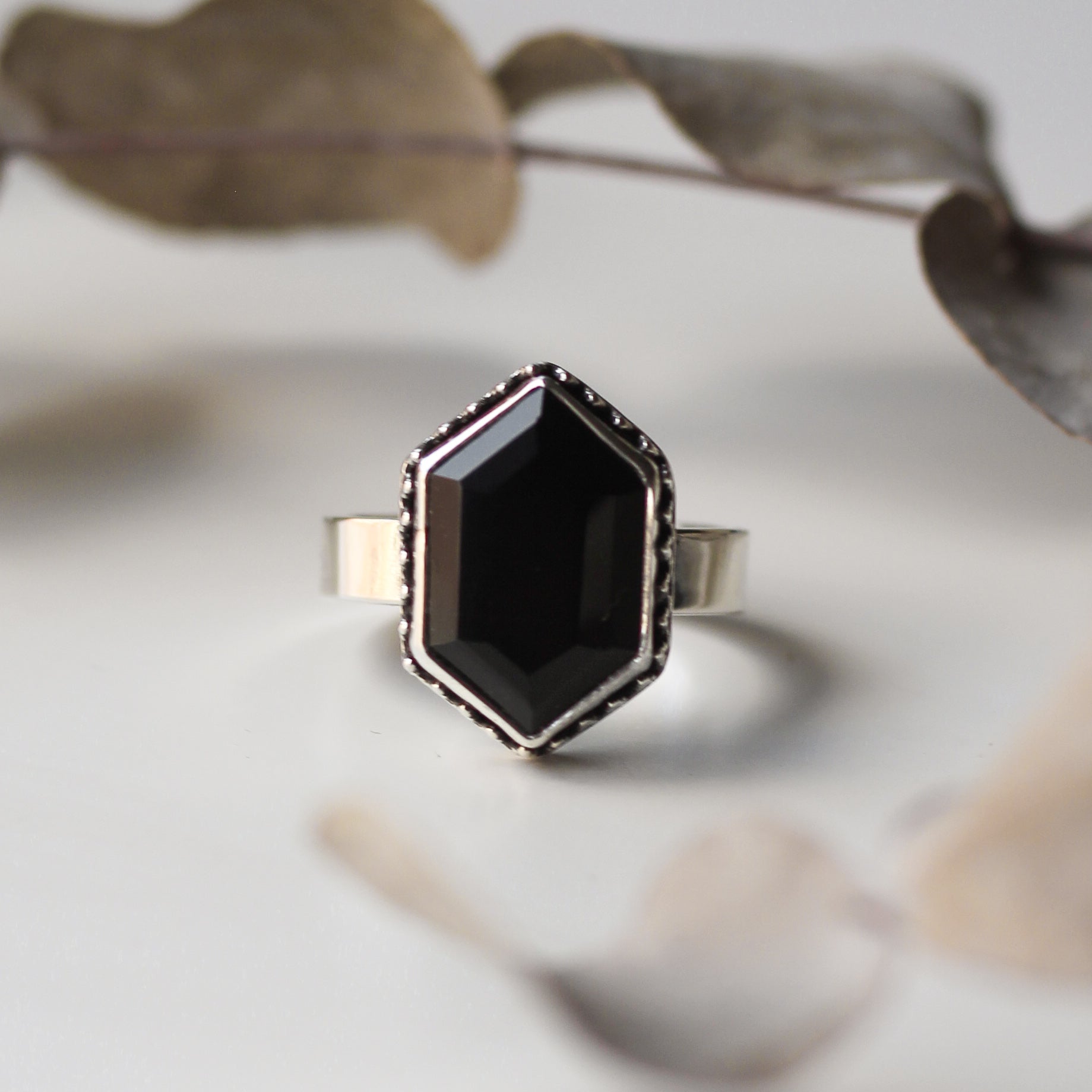 This Sterling Silver ring contains one 16mm x 10mm Black Onyx.